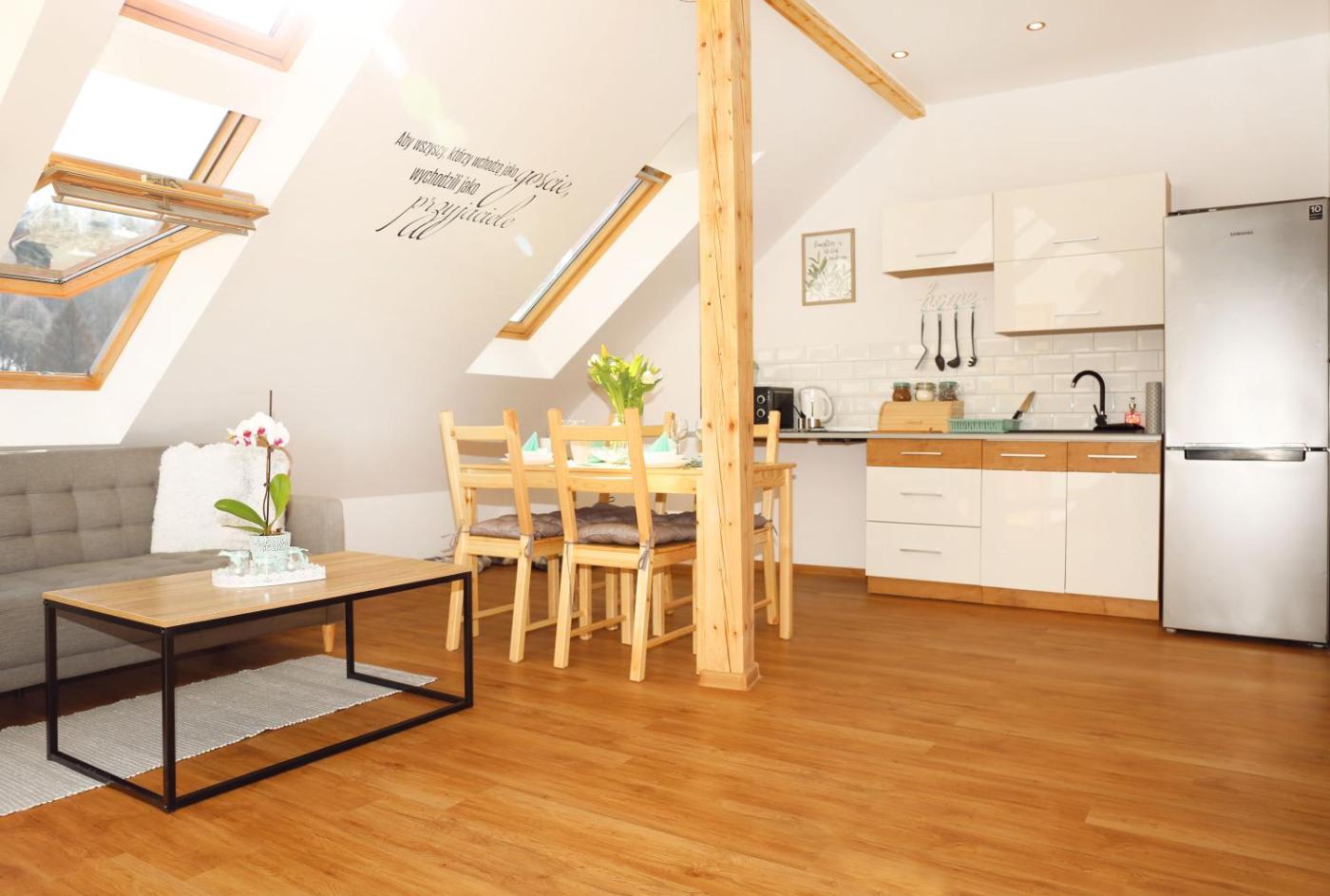 Apartament. Featuring a private entrance, this apartment consists of 1 living room, 2 separate bedrooms and 1 bathroom with a walk-in shower and a hairdryer. The well-equipped kitchen features a stovetop, a refrigerator, a dishwasher and kitchenware. The apartment provides a washing machine, a seating area, a dining area, a flat-screen TV with cable channels, as well as mountain views. The unit offers 4 beds. Apartament - 7 osobowy. Powierzchnia pokoju ok.: 56 mkw.